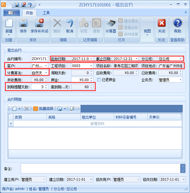1、點擊【租出管理】→【租出合約】→【新建】租出合約單,確定起始日期,客戶,選擇工程項目,選擇租賃站與客戶商定的計費算法;軟件支持設置合約到期提醒,提醒租賃站工作人員跟進該項合約情況,與客戶協商后期租賃事項,是否延長合約的期限,如圖: