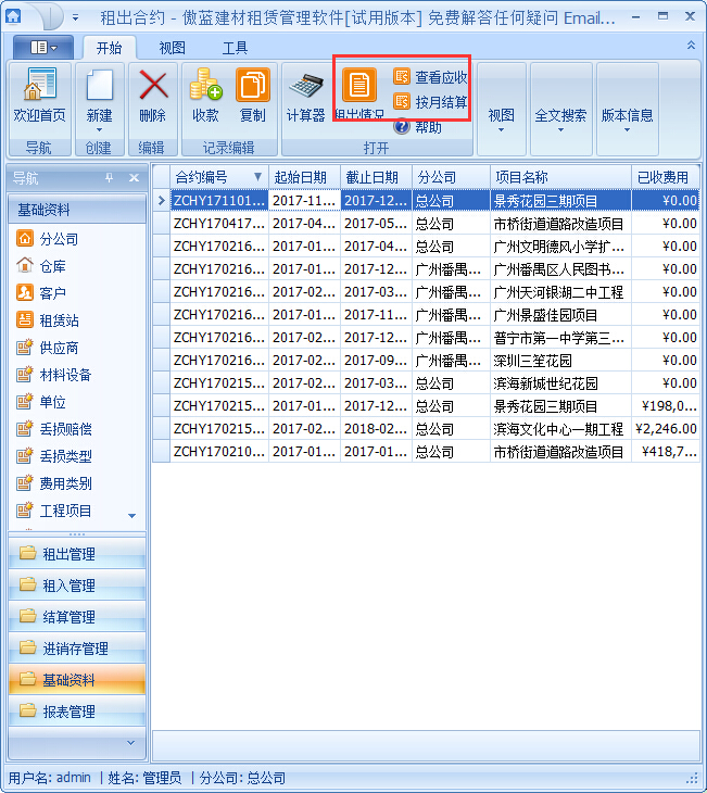 傲藍建筑設備租賃軟件租出合約管理的具體操作步驟: