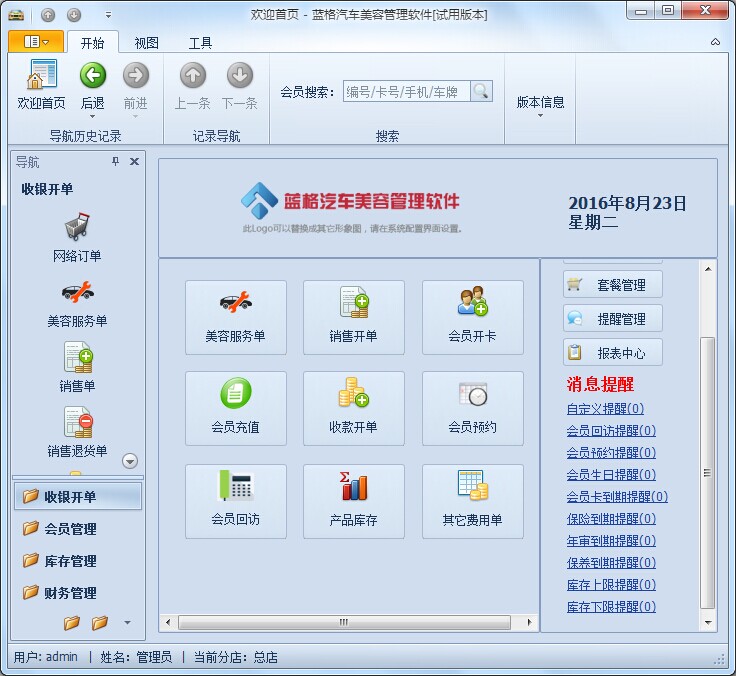 3. 由于每個(gè)用戶(hù)只屬于一個(gè)汽車(chē)美容店。所以操作用戶(hù)登錄后,也就知道是登錄哪個(gè)汽車(chē)美容鋪了。如下圖狀態(tài)欄顯示的當(dāng)前汽車(chē)美容店鋪的名字。在歡迎界面中可以看到
