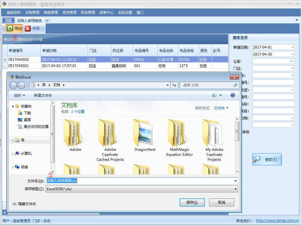傲藍布匹行業管理軟件提供了豐富的導出數據功能,全部的軟件列表可以導出excel文件,如:采購訂單,采購入庫單,采購退貨單,銷售訂單,銷售出庫單,銷售退貨單 還有庫存管理中各列表界面都可以導出當前查詢獲取的列表數據為excel文件。