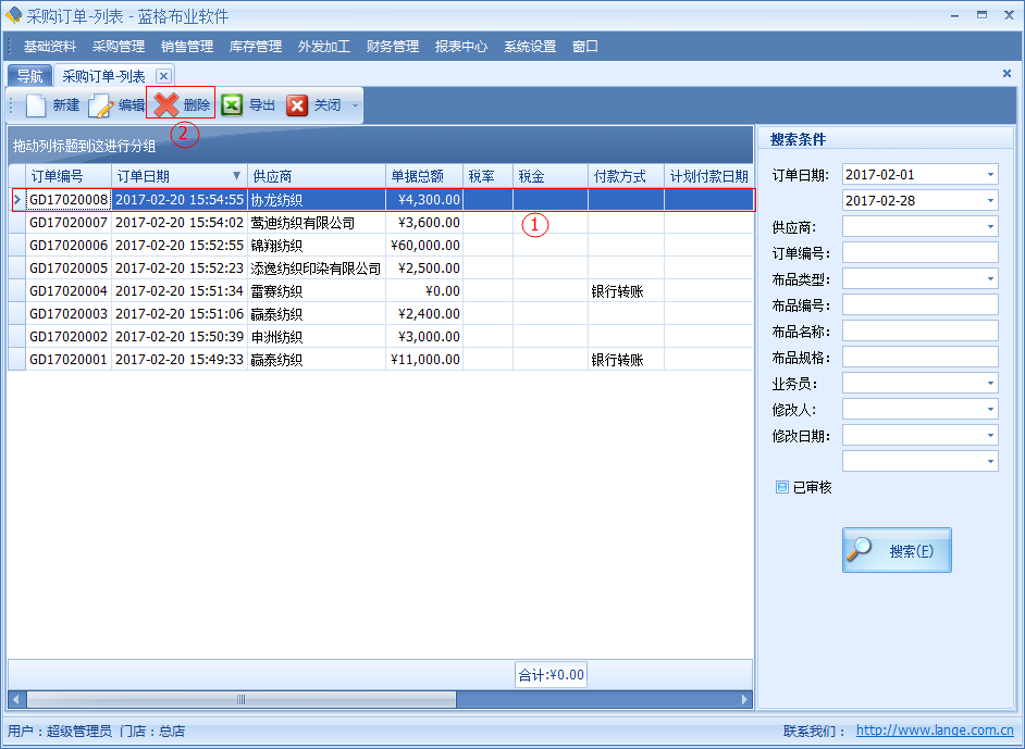 如需要對采購訂單中某一條數據進行刪除的,通過采購訂單列表選中一條記錄點擊【刪除】按鈕,刪