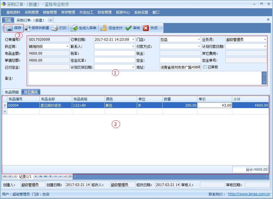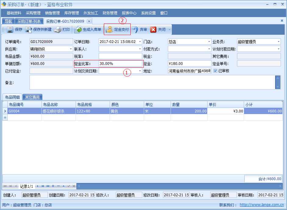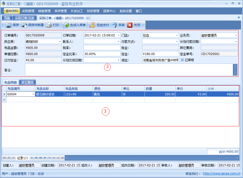 【采購訂單】中記錄了開單日期、供應商、供應商聯系人、交貨日期、付款日期、付款方式、金額、定金、稅率、稅金等信息。明細數據中是該單據采購布品名稱,顏色,單位,數量價格等詳細數據。