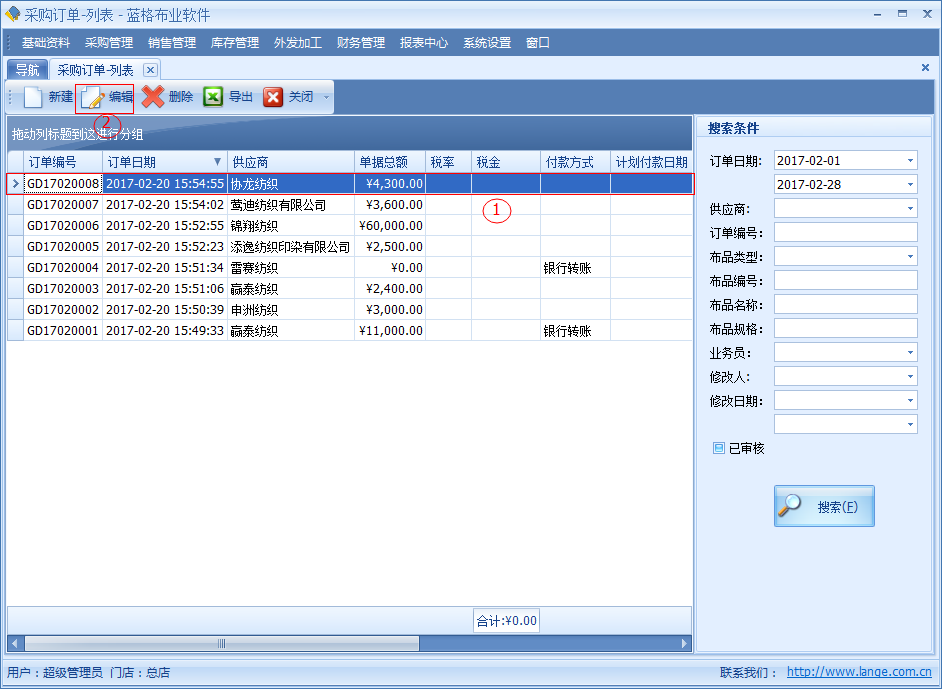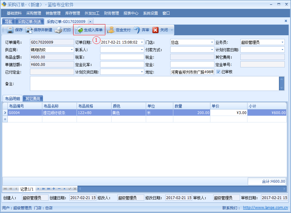 傲藍布行管理系統采購訂單管理,采購訂單主要是用于,采購時按照所需要的布品,進行登記。