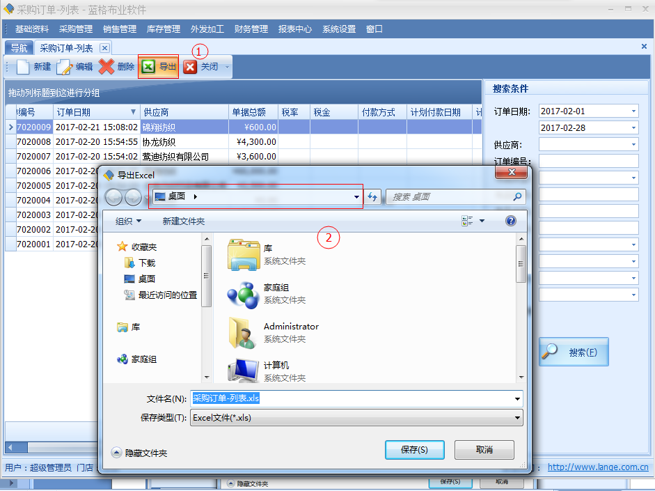 具體步驟如下圖:①采購管理;②選擇采購訂單,進入列表界面。