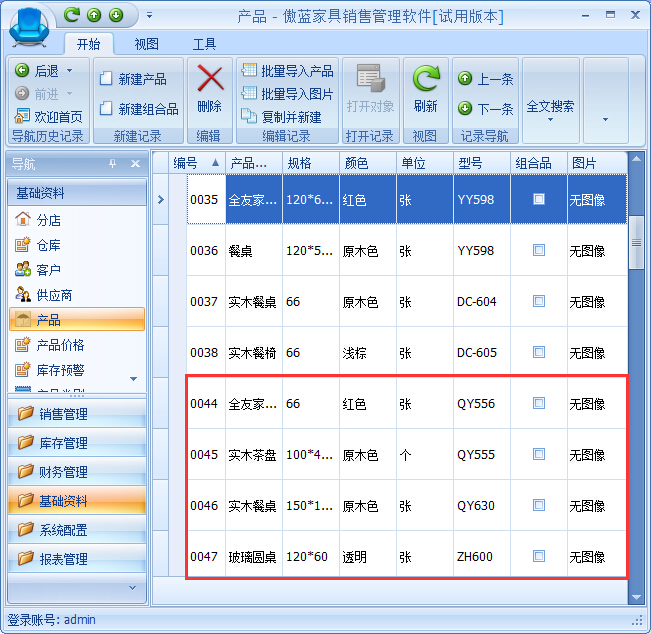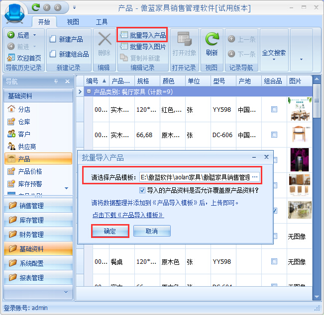 ⑤導(dǎo)入完成之后,傲藍家具店鋪收銀系統(tǒng)就會在產(chǎn)品資料中新增導(dǎo)入的產(chǎn)品,如圖:
