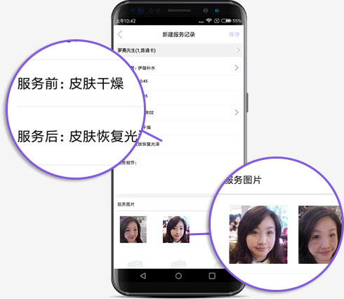 美容院手機APP可以協(xié)助美容師在為會員做服務時及時登記服務日志,將服務前后的圖片及時拍下來并上傳到服務記錄上,做好服務前后的對比,既能作為服務項目的案例,也是美容師工作的記錄。