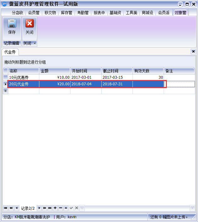 在傲藍(lán)皮具護(hù)理店會(huì)員軟件中新建代金券及發(fā)放代金券管理具體操作:
