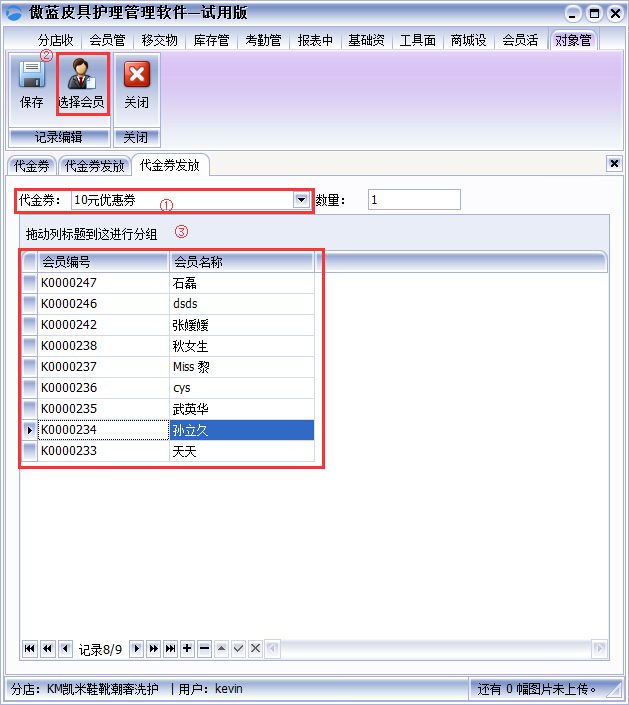 ②在代金券發(fā)放界面,選擇需要發(fā)放的代金券,再批量選擇需要發(fā)放的會(huì)員(會(huì)員列表,按住shift鍵鼠標(biāo)左鍵點(diǎn)擊可多選),會(huì)員選擇完成,保存,如圖: